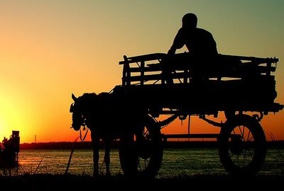 Um carroceiro levava a carroça muito carregada por uma estrada lamacenta.