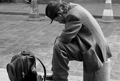 Um mendigo estava sentado junto a uma calçada e descansava.